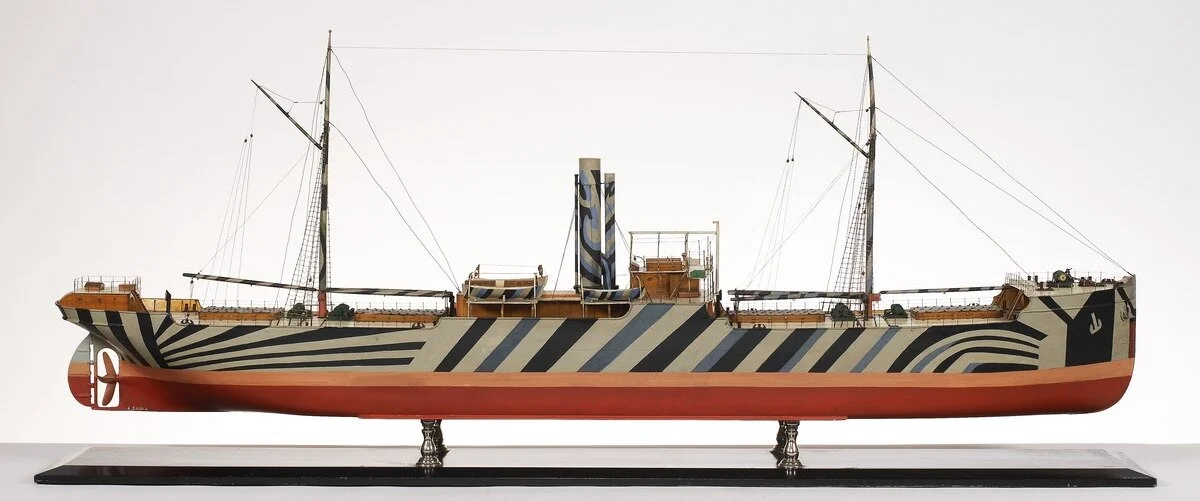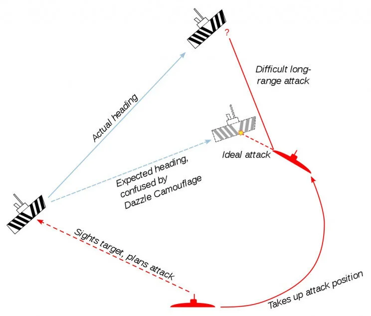 His take was a lot bolder.. Accepting that vessels could never be disguised, the aim was to create as much visual confusion as possible. By applying a cornucopia of contrasting patterns and colours to the ships, it became difficult for the enemy to discern the shape and class of ship, as well as its speed and course. This meant that trying to calculate the trajectory for a torpedo (typically from a distance of around 1.5 miles away) became very difficult, and the slightest misalignment could mean the difference between being hit or not..